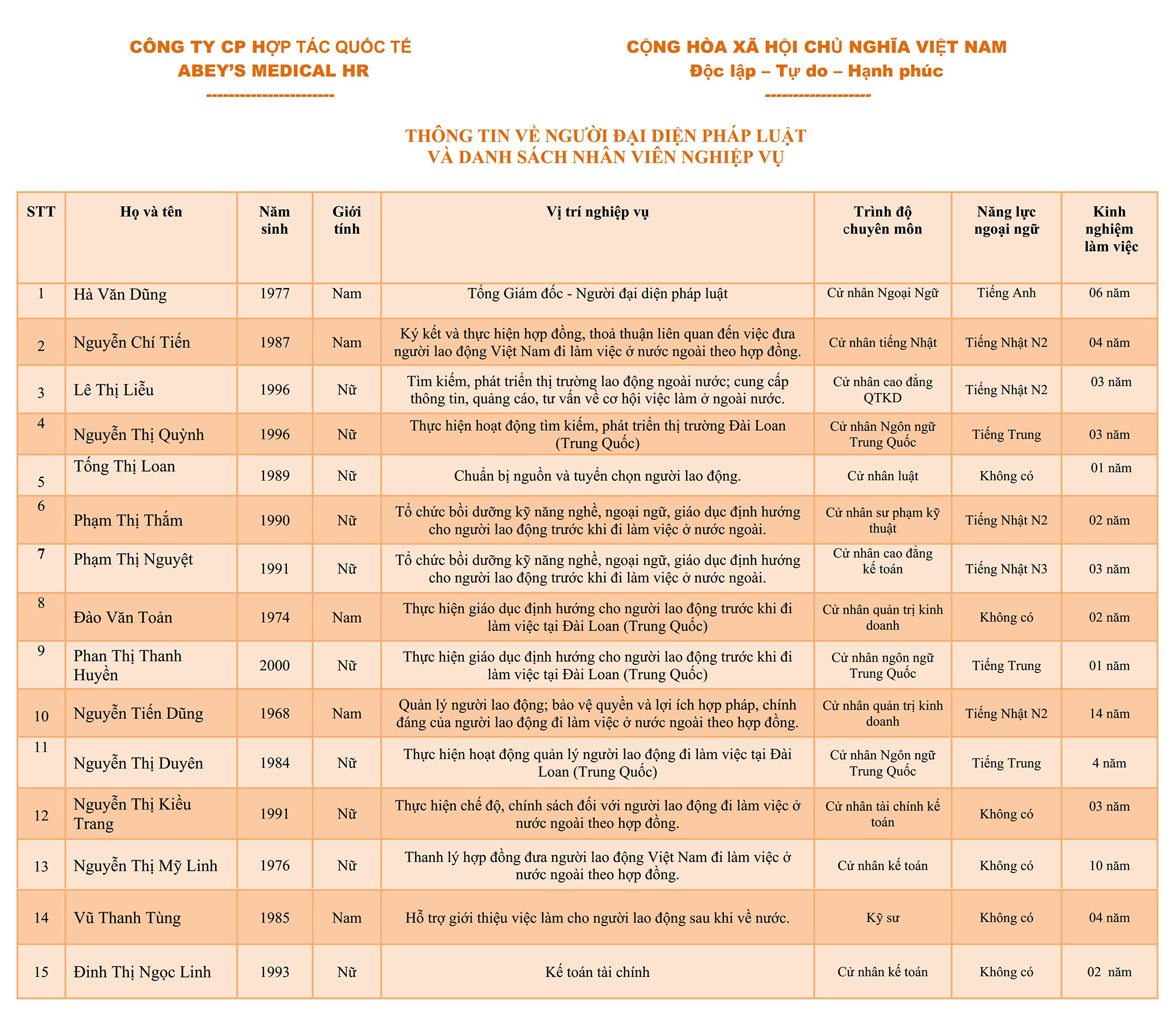 THÔNG TIN VỀ NGƯỜI ĐẠI DIỆN PHÁP LUẬT VÀ DANH SÁCH NHÂN VIÊN NGHIỆP VỤ